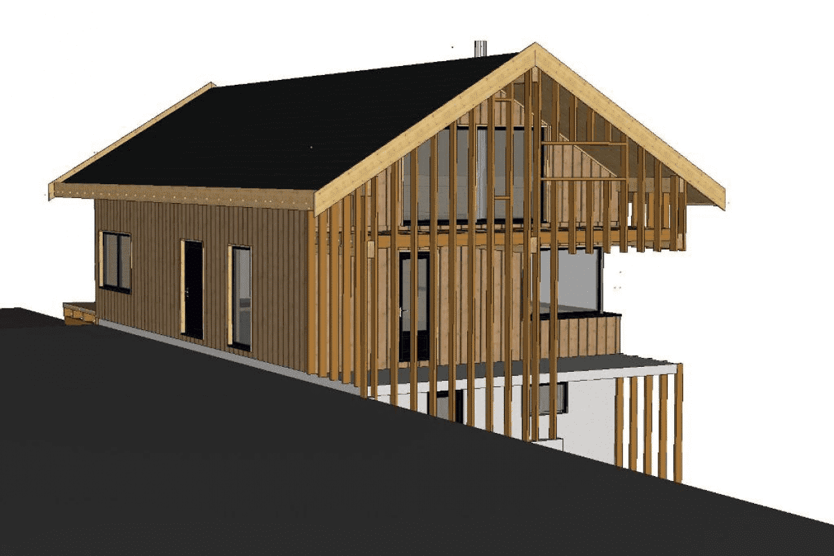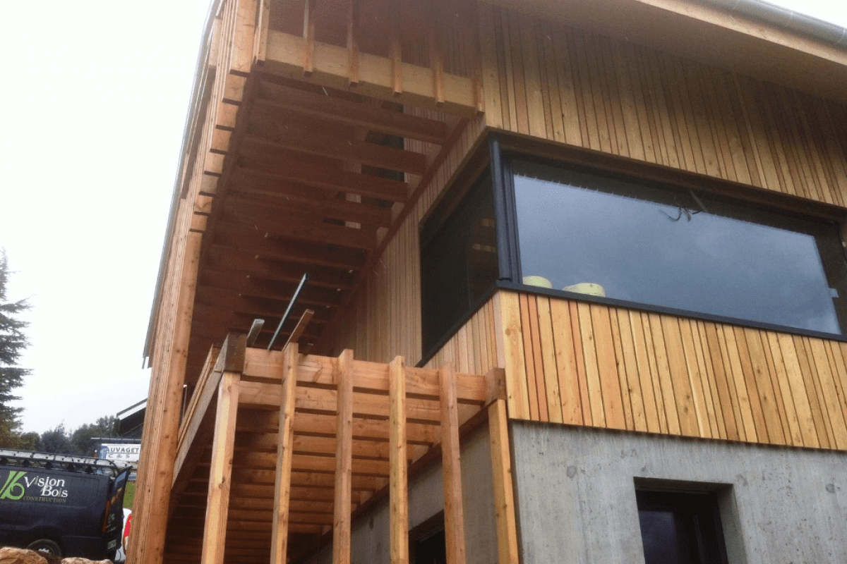 Maison ossature bois constuite à Alex en Haute Savoie. Sur cette maison en ossature bois il y a un bardage mélèze verticale sur mesure avec 3 largeur de lames différente.